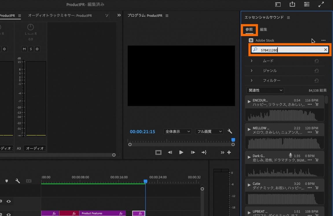 「エッセンシャルサウンドパネル」から「参照」のタブを選択し、お好きな楽曲を選びます。