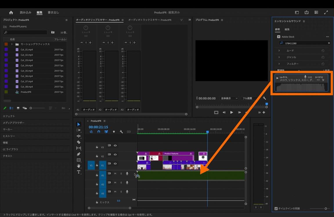 「Lo-Fi Vlog Is」の楽曲が表示されたらタイムラインパネル上の「A1」にドラッグ&ドロップします。