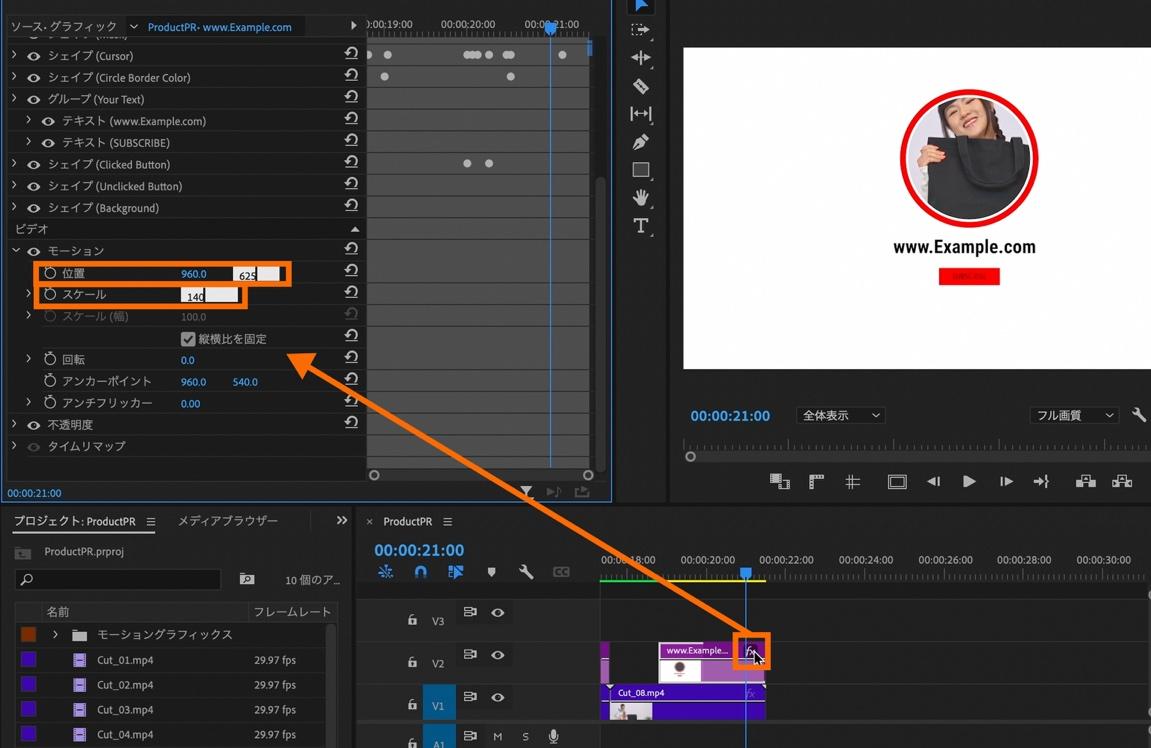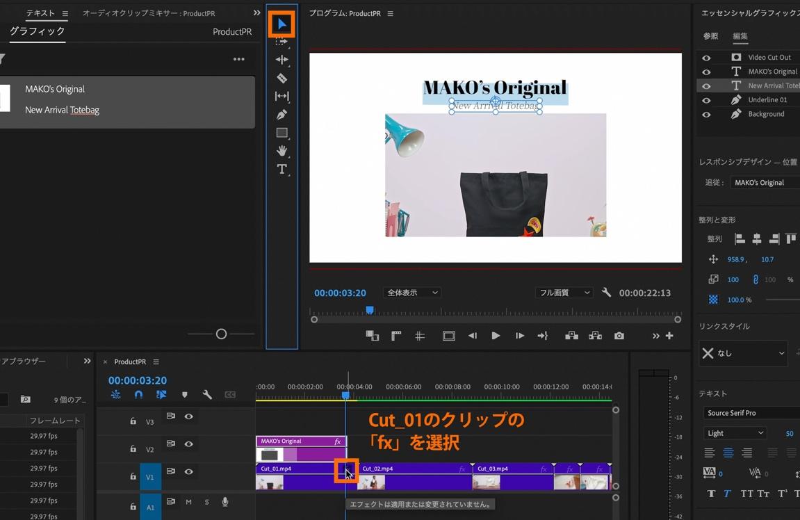 次に、クリップの大きさをテンプレートの枠に合うよう調整しましょう。ツールバーを「選択ツール」に切り替えて、タイムライン上の下画のクリップ(Cut_01)の横にある「fx」マークを選択。