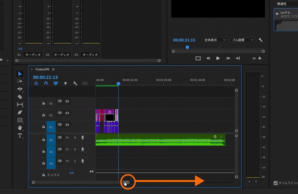 楽曲のクリップ全体が見えるように、タイムラインパネル下部のスケールを調整します。