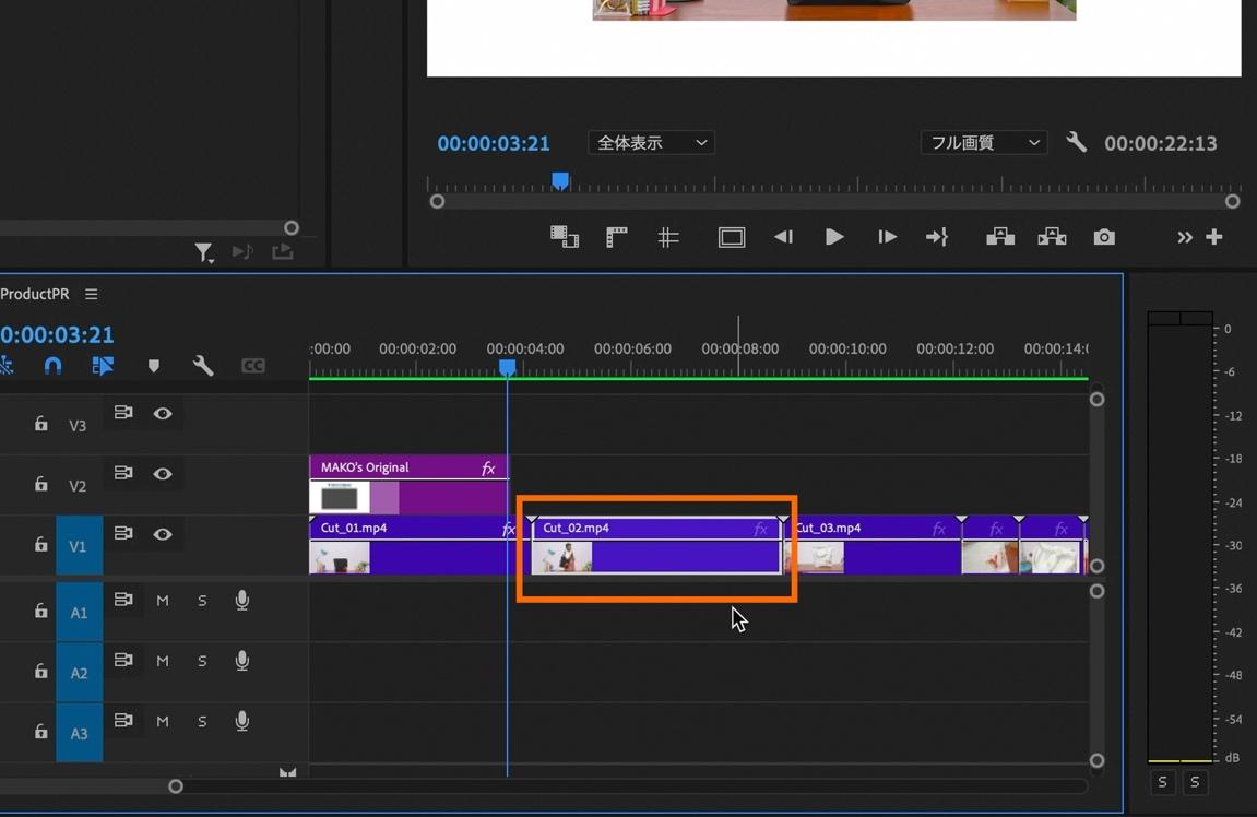 今回取り込んだクリップの内、「Cut_02」はそのまま使用しないので、タイムライン上でクリップを選択してDeleteキーで削除します。
