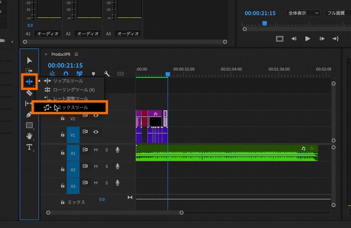 タイムラインパネル横にある「ツールバー」内の「リップルツール」を右クリックしてプルダウンから「リミックスツール」を選択します。