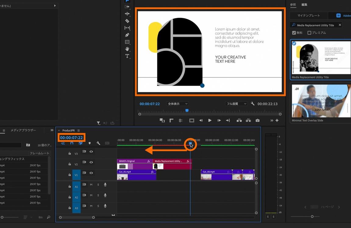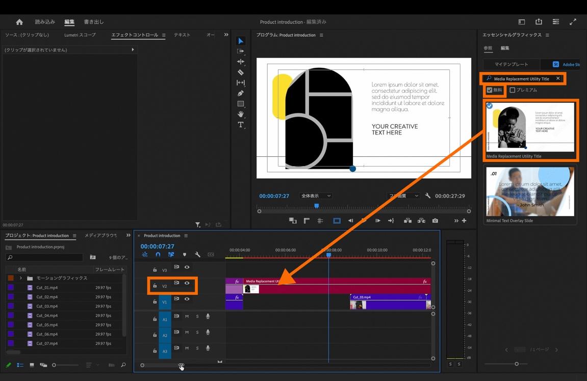 「無料」にチェックを入れたら、パネルの検索フィールドに「Media Replacement Utility Title」と入力します。「Media Replacement Utility Title」が表示されたら、タイムラインパネル上の[V2]にドラッグ&ドロップします。