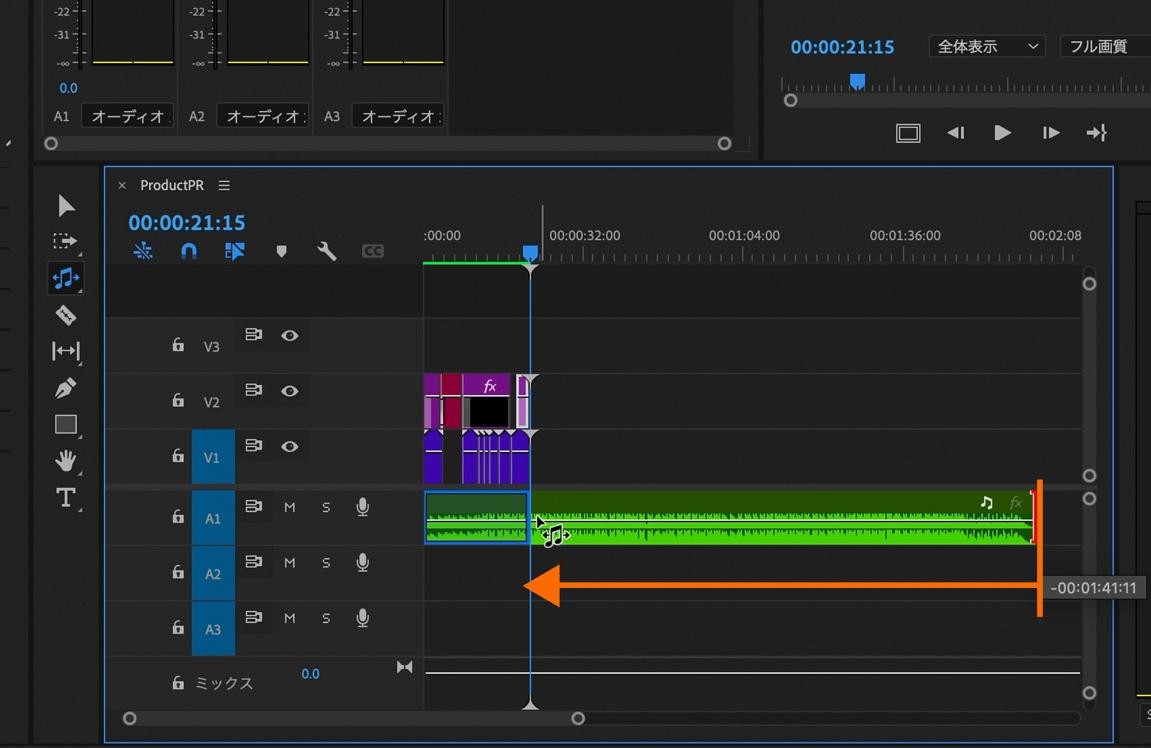 タイムラインパネル上の「A1」にある楽曲クリップの末尾をSTEP4までに編集した映像の終了点までドラッグします。(終了点までドラッグする事でAIが自動的に楽曲を最適な尺に調整してくれます。)