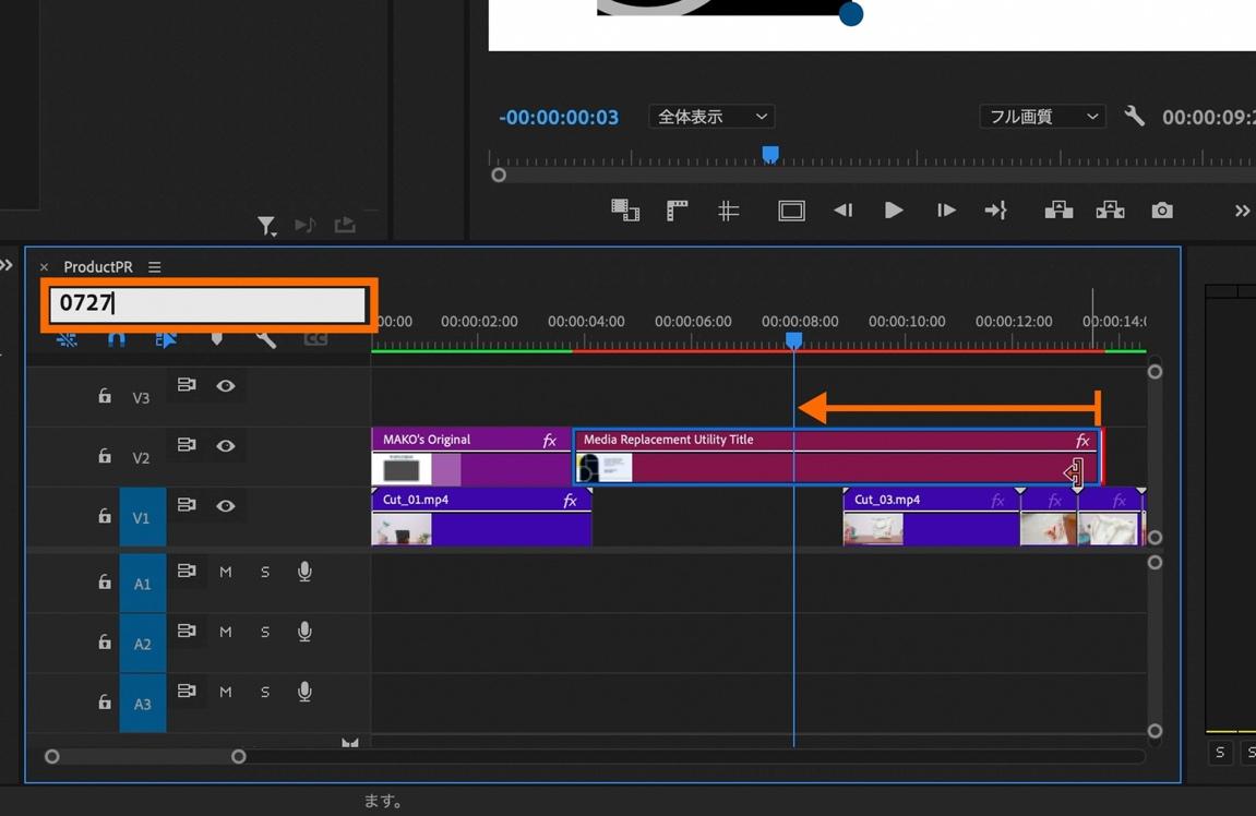タイムライン上のCut_03〜Cut_08のすべてのクリップを選択して、6つのクリップをSTEP2までに編集した映像の終了点 (V1)にクリップを移動します。