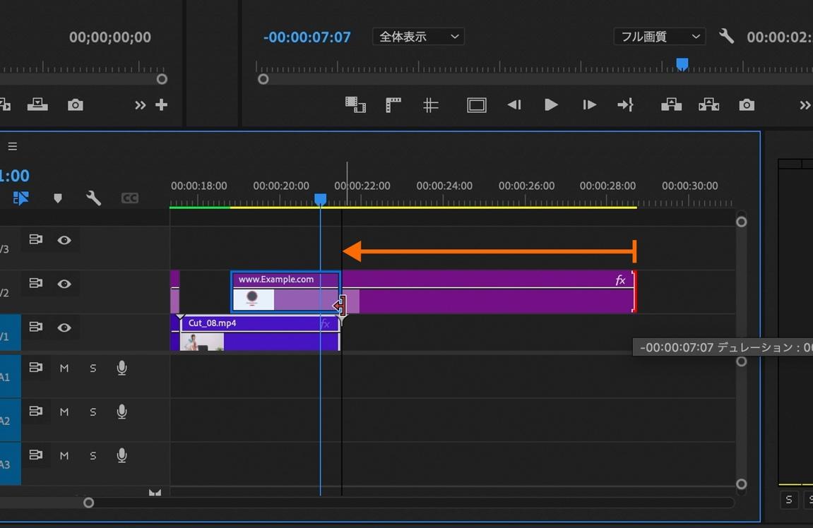 V2に配置したモーショングラフィックステンプレートクリップの末尾を再生ヘッドのある0:00:07:27までドラッグしてクリップを縮めます。