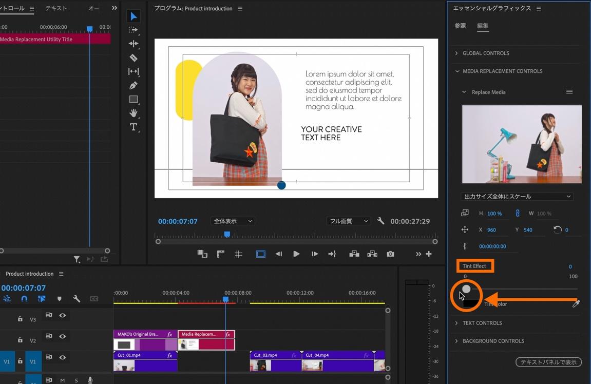 初期設定ではクリップがモノクロになるように設定されているのでカラーに変更するために、「エッセンシャルグラフィックスパネル」内の「Tint Effect」の数値バーをドラッグして0に変更。