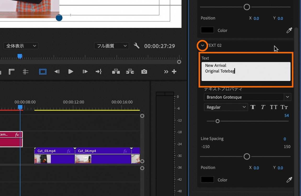 「エッセンシャルグラフィックスパネル」内の「TEXT 02」の>マークを開き、「Text」の中にある既存のテキストを全て選択してご自身の表示したいテキストを入力します。今回は以下の文言を入力。