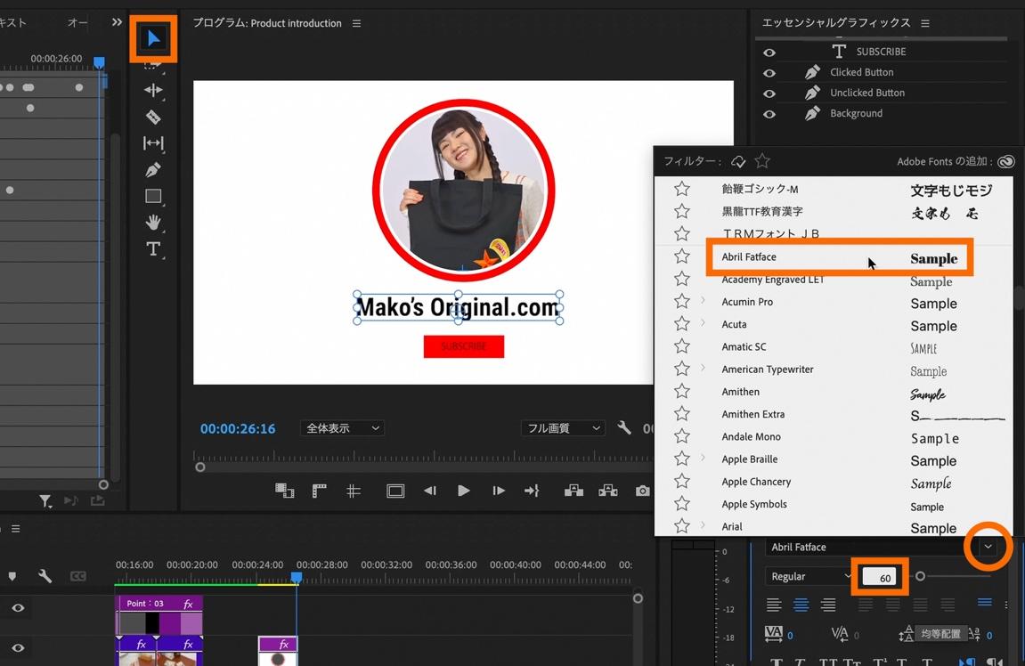 ツールバーから「選択ツール」を選択し、全体の統一感を出すためにフォントを冒頭で使用したものと同様のものに変更します。フォントパネルから「Abril Fatface」を選択。
