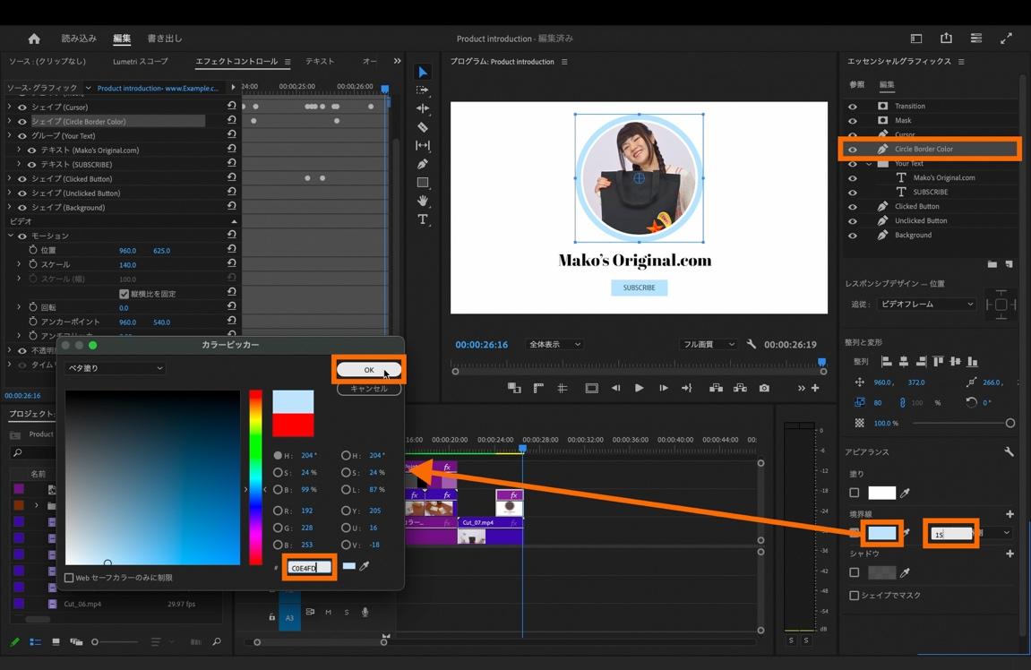 エッセンシャルグラフィックスパネル内の「Circle Border Color」を選択し、アピアランス内の「境界線」の横にある色指定の部分をクリックして「カラーピッカー」からお好みの色味を選択します。