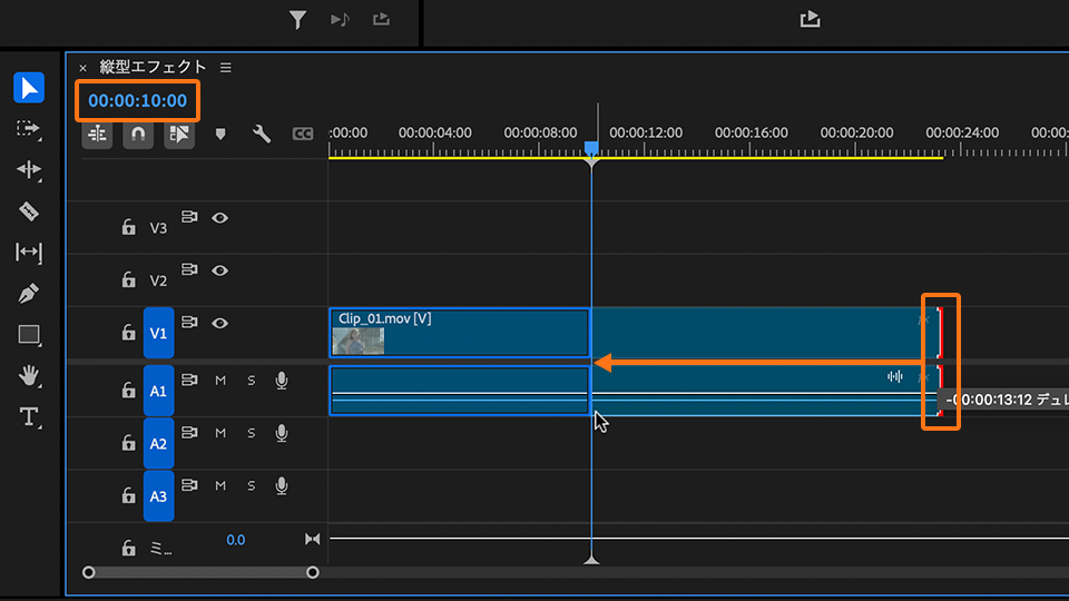 シーケンス内のクリップの末尾をドラッグして、長さを「00:00:10:00」に縮めます。