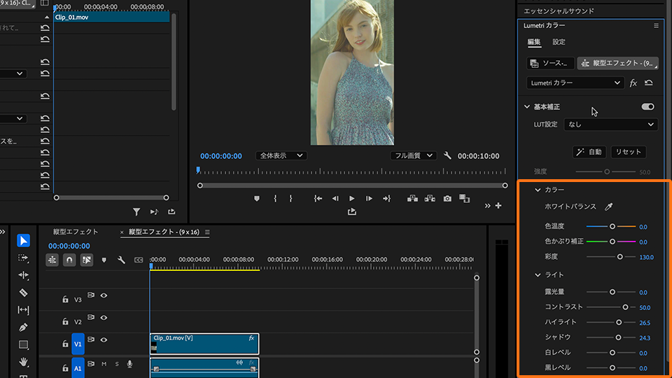 タイムラインの「Clip_01.mov」クリップを選択した状態で「Lumetriカラー」パネルを開きます。「基本補正」を下記のように設定します。