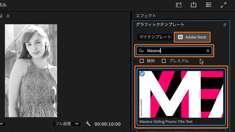 「グラフィックテンプレート」パネルを選択し、その中の「Adobe Stock」を選択します。パネルの検索フィールドに「Massive」と入力すると「Massive Sliding Promo Title Text」が表示されます。