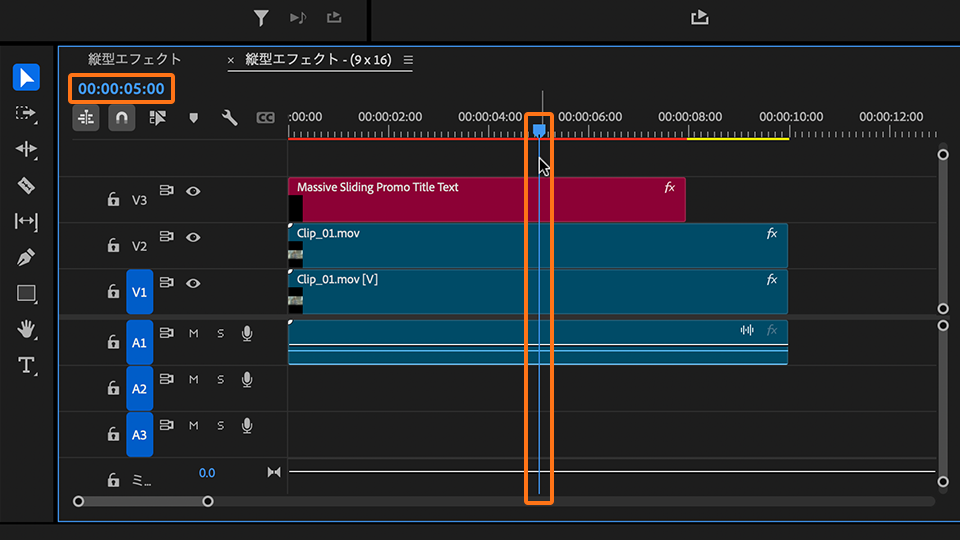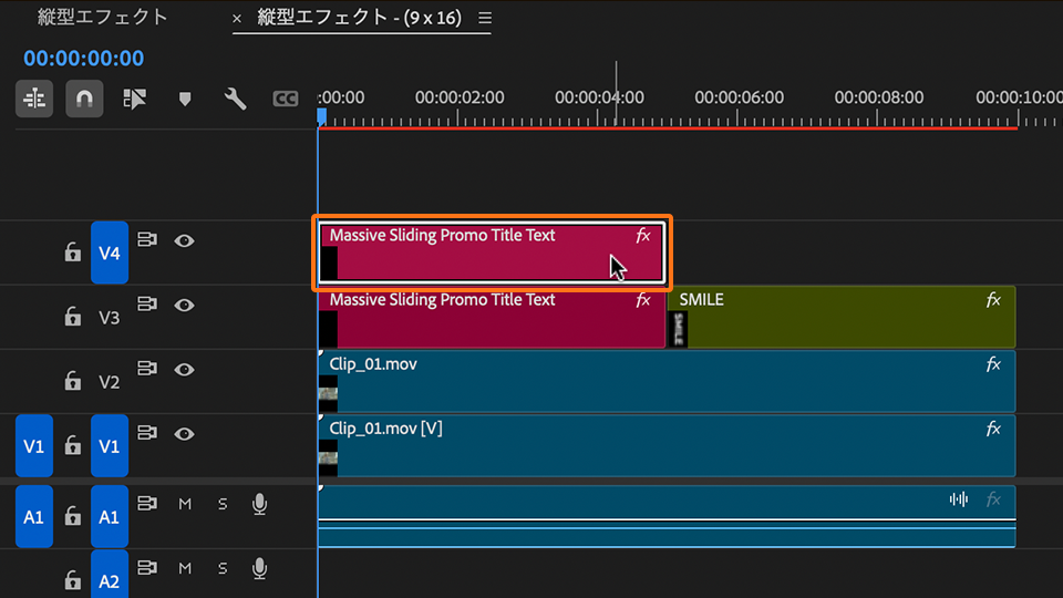 追加した「V4」のタイムラインに、「V3」の前半にある「Massive Sliding Promo Title Text」をコピーして貼り付けます。