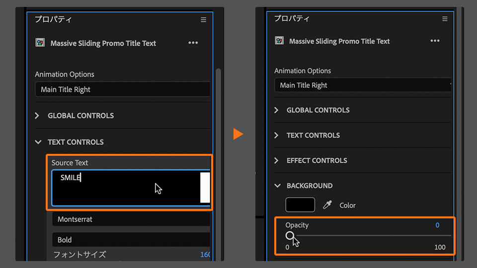 「プロパティ」パネルを開き、「TEXT CONTROLS」内の「Source Text」に「SMILE」と打ち込み、「BACKGROUND」内の「Opacity」を「0」に設定します。(※今回は「SMILE」ですがお好きな言葉を入れてみてください)