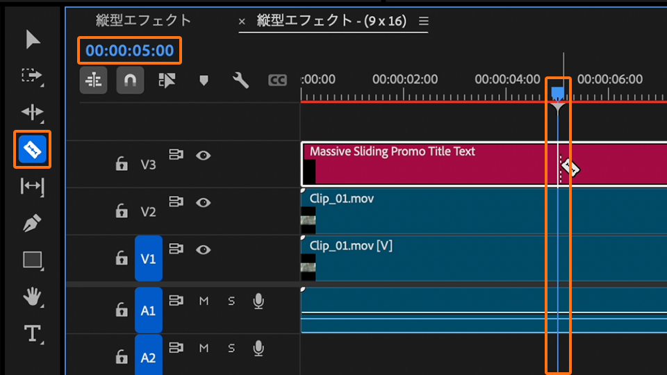 「ツール」パネルから「レーザーツール」を選択し、再生ヘッドを「00:00:005:00」に合わせて「Massive Sliding Promo Title Text」をカットします。