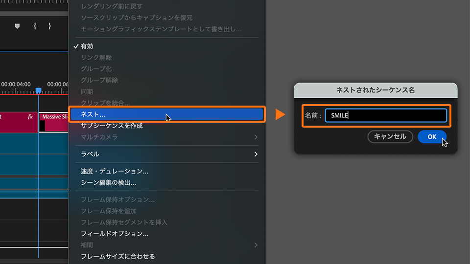 タイムライン後ろの「Massive Sliding Promo Title Text」テキストを選択し、右クリックから「ネスト」を選択します。「ネストされたシーケンス名」を「SMILE」に設定します。