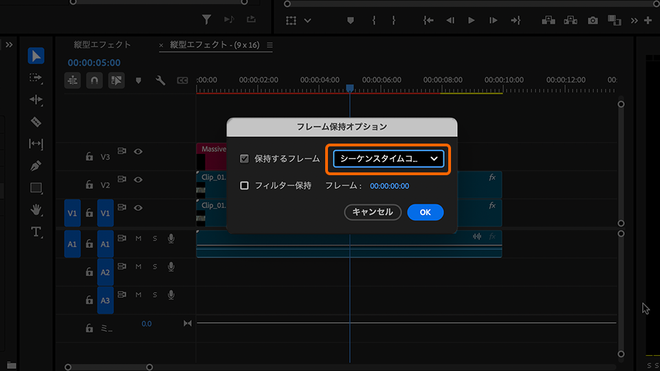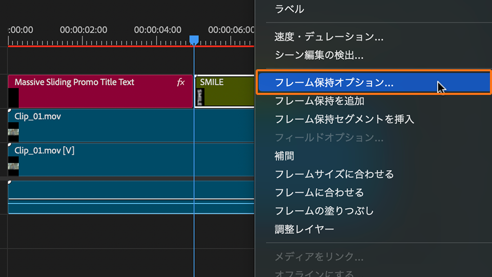 再生ヘッドが「00:00:05:00」にあり、ネストシーケンスの「SMILE」が選択されていることを確認し、右クリックします。「フレーム保持オプション...」を選択。「フレーム保持オプション」内の「保持するフレーム」を「シーケンスタイムコード」に変更します。