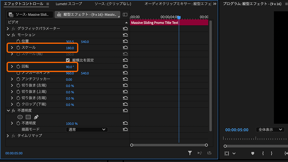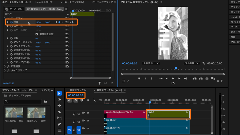 再生ヘッドを「00:00:05:00」に合わせて、2つある「Massive Sliding Promo Title Text」の後半を選択します。「エフェクトコントロール」パネル内の「位置」にキーフレームを打ちます。さらに、10フレーム進め「位置」を「130:540」に設定します。