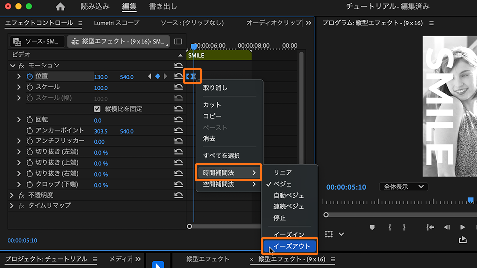 「位置」プロパティの2つのキーフレームを両方選択し、右クリックのメニューから「時間補間法」の「イーズイン」と「イーズアウト」を両方を適用させます。