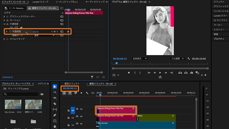「V4」のタイムラインにある「Massive Sliding Promo Title Text」テキストを選択して、再生ヘッドの位置を「00:00:00:15」に合わせます。「エフェクトコントロール」パネル内の「不透明度」を「50.0%」にしてキーフレームを打ちます。