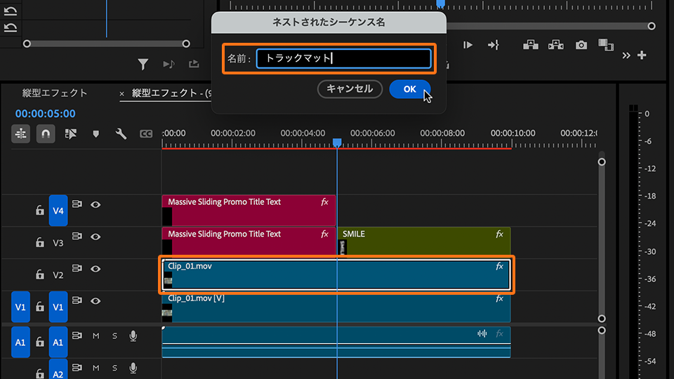 タイムライン上の「v2」にある「Clip_01」を右クリックし「ネスト...」を選択、「ネストされたシーケンス名」を「トラックマット」に設定します。