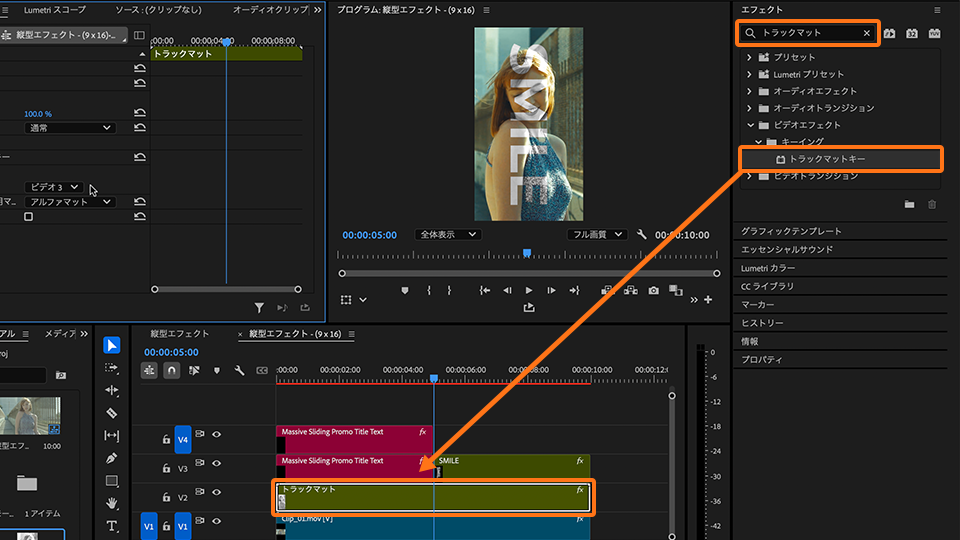 「トラックマットキー」が表示されたら、それをタイムラインの「V2」の「トラックマット」クリップ上にドラッグ&ドロップで適用します。
