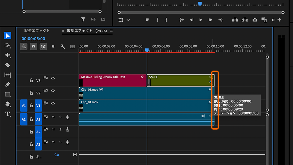 タイムライン後ろの「Massive Sliding Promo Title Text」をクリップの長さを「Clip_01.mov」クリップと同じになるように合わせます。