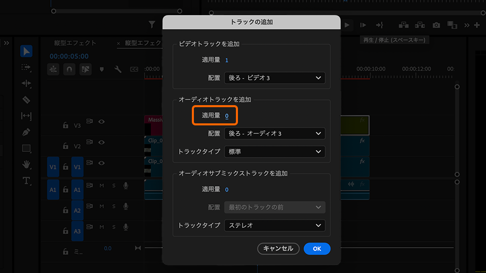 「オーディオトラック」内の「適用量」を「0」にして[OK]を押します。これで、タイムラインに「V4」が表示されます。