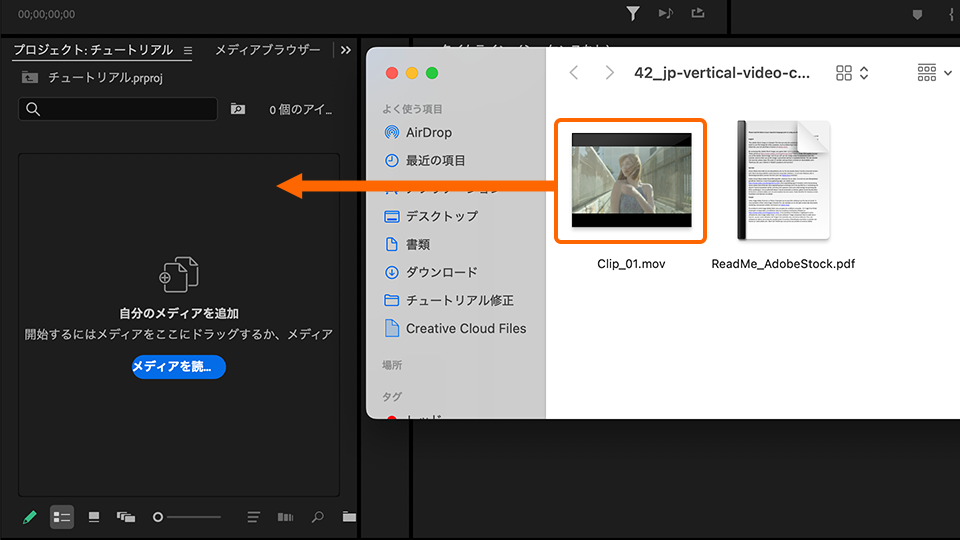 ダウンロードした練習用のデータ素材「Clip_01」を「プロジェクト」パネルにドラッグ&ドロップして追加します。