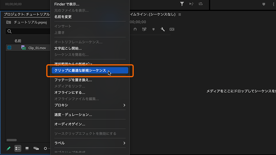 「プロジェクト」パネルで「Clip_01.mov」を選択し、右クリックから「クリップに最適な新規シーケンス」を選択。タイムラインに素材を追加します。その際シーケンス名を「縦型エフェクト」に変更します。