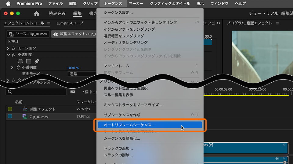 タイムライン上の「Clip_01.mov」を選択し、メニュー「シーケンス」から「オートリフレームシーケンス...」を選択。