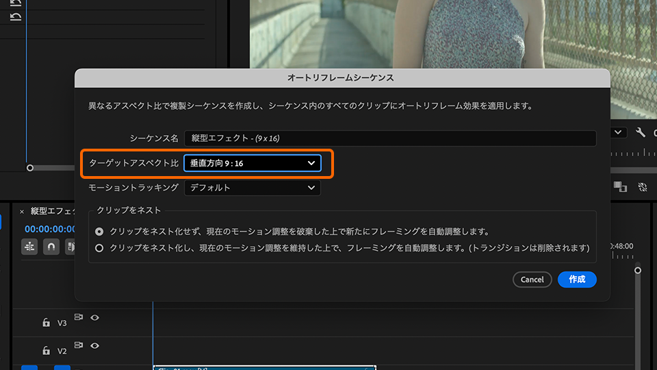 「オートリフレームシーケンス」内の「ターゲットアスペクト比」から「垂直方向9:16」を選択し[作成]をクリックします。自動で「オートリフレーム」が適用されます。