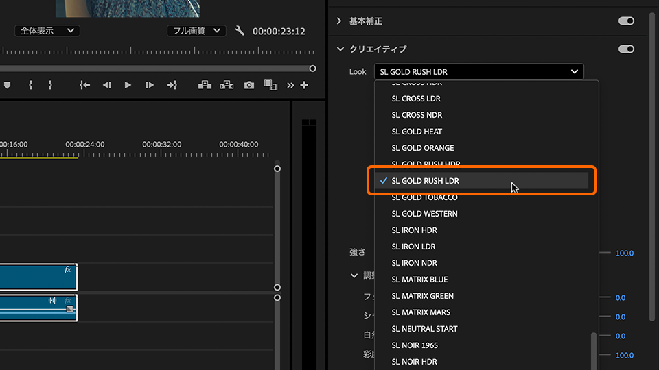 次に「Lumetriカラー」パネル内の「クリエイティブ」を開き、「Look」を「SL GOLD RUSH LDR」に変更します。