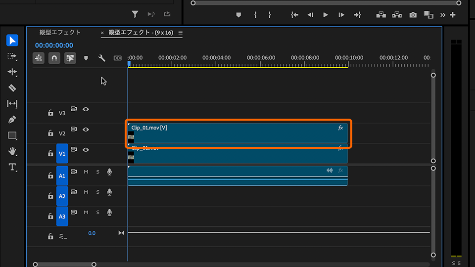操作が終わったら、調整した「Clip_01.mov」クリップを「V2」に複製します。