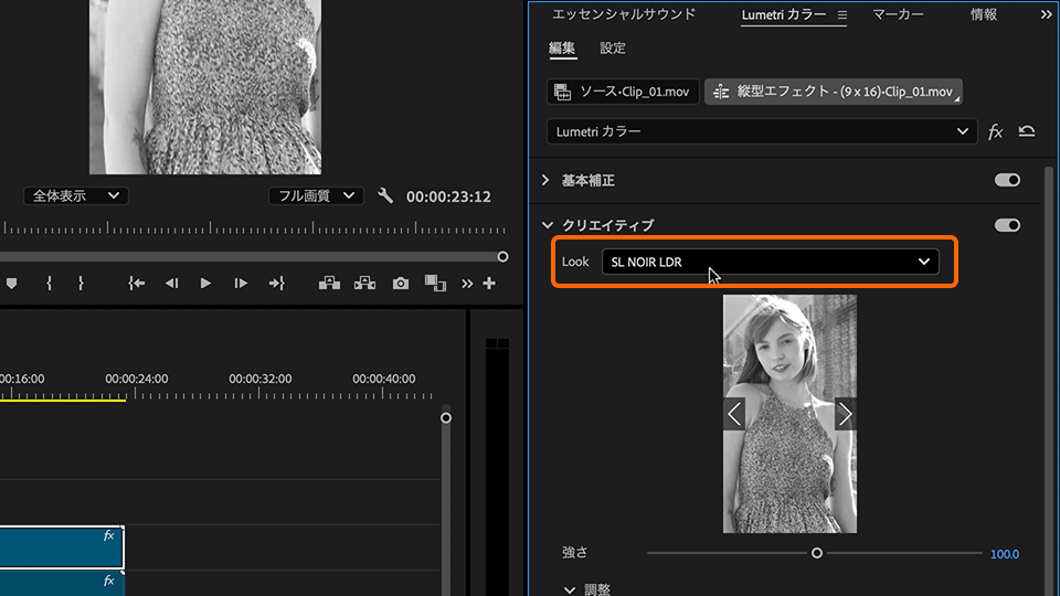「V1」と同じように、「Lumetriカラー」パネル内の「クリエイティブ」を開き、「Look」を「SL NOIR LDR」に変更します。