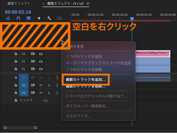 タイムライン左側の空白の部分を右クリックをし、「複数のトラックを追加...」を選択。