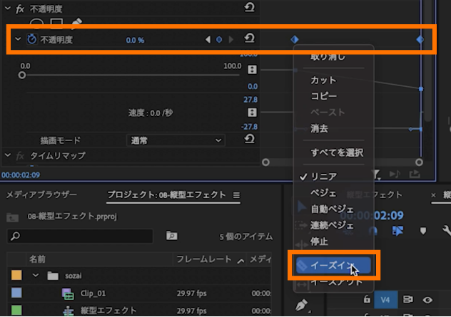 再生ヘッドの位置を「00:00:05:00」にして「不透明度」を「0%」にします。「00:00:00:15」と「00:00:05:00」のキーフレームを両方選択し、右クリックから「イーズイン」を選択します。