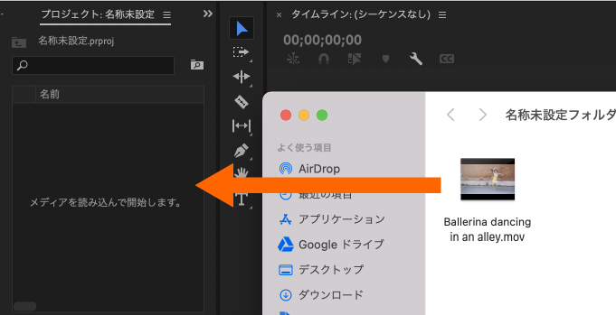 練習用のデータ素材「Ballerina dancing in an alley」を「プロジェクト」パネルにドラッグ&ドロップし追加します。
