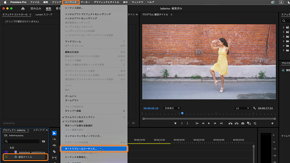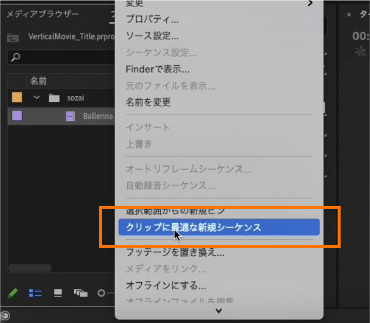 「プロジェクト」パネルで「Ballerina dancing in an all」を選択し、右クリックから「クリップに最適な新規シーケンス」を選択します。タイムラインに素材を追加します。その際シーケンス名を「縦型タイトル」にします。