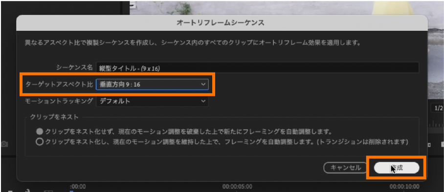 「オートリフレームシーケンス」内の「ターゲットアスペクト比」のタブから「垂直方向9:16」を選択し[作成]をクリックします。自動で「オートリフレーム」が適用されます。