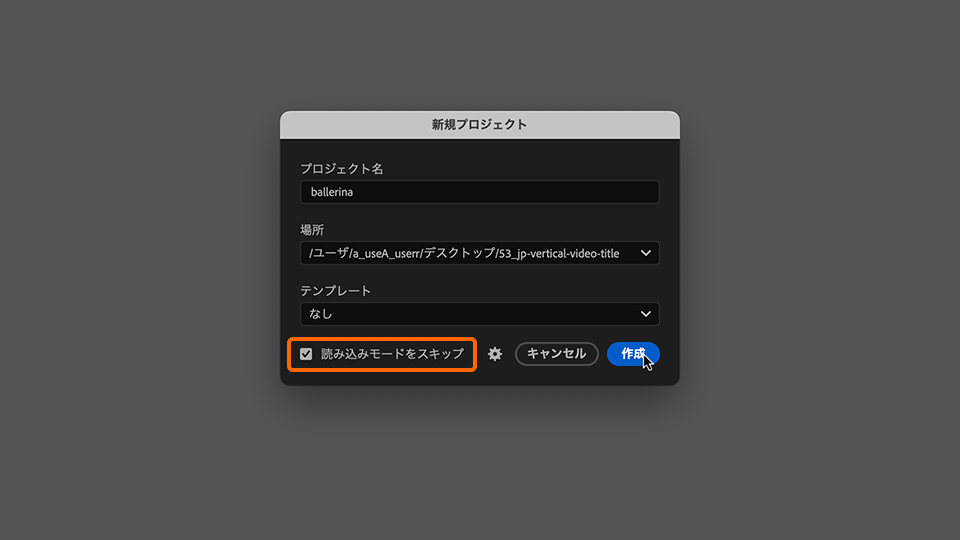 「新規プロジェクト」画面が表示されたら、プロジェクト名と保存先を指定します。「読み込みモードをスキップ」にチェックを入れ、[作成] をクリックします。