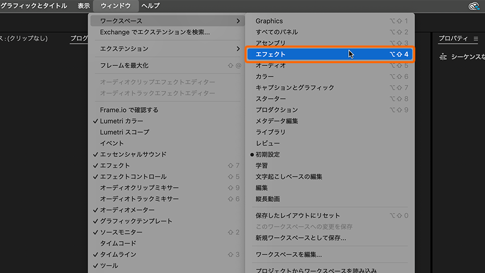 Premiere Proの編集画面が立ち上がったら、ワークスペースを「エフェクト」に変更します。