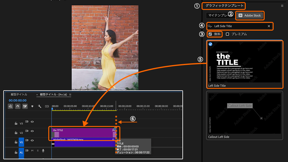 ①「グラフィックテンプレート」パネルを選択し、②その中の「Adobe Stock」を選択します。③「無料」にチェックを入れ、④パネルの検索フィールドに「Left Side Title」と入力して検索します。「Left Side Title」が表示されたら、⑤タイムラインの「V2」にドラッグ&ドロップし、⑥タイムライン上の「Ballerina dancing in an all」と同じ長さに調整します。