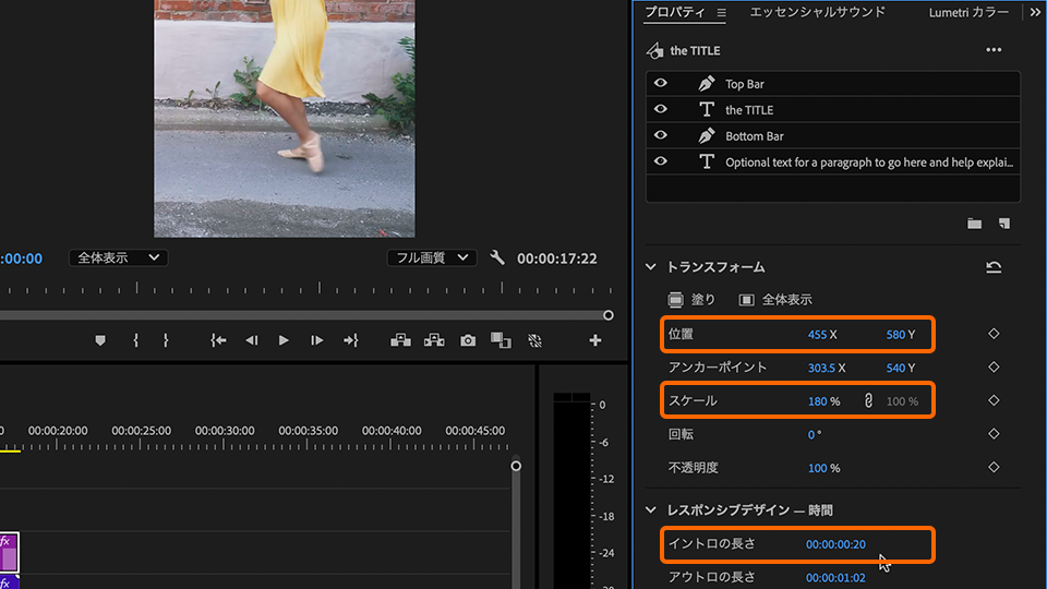 3. 「レシポンシブデザインー時間」内の「イントロの長さ」を「00:00:00:20」に変更します。