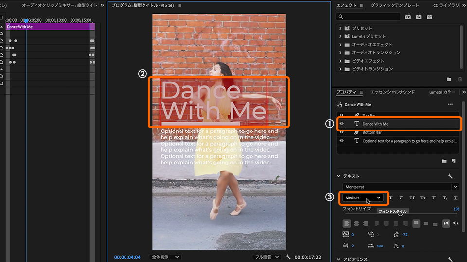 4. ①「プロパティ」パネル内の「the TITLE」を選択し、②プログラムモニター内のテキストボックスに「Dance With Me」と入力します。