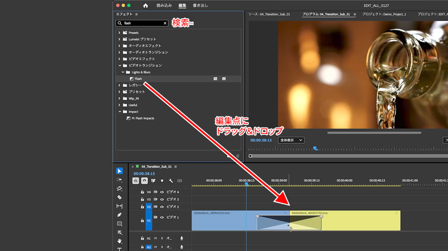 エフェクトパネルから「Flash」で検索していただいて クリップとクリップの間にドラッグ&ドロップして適用します。