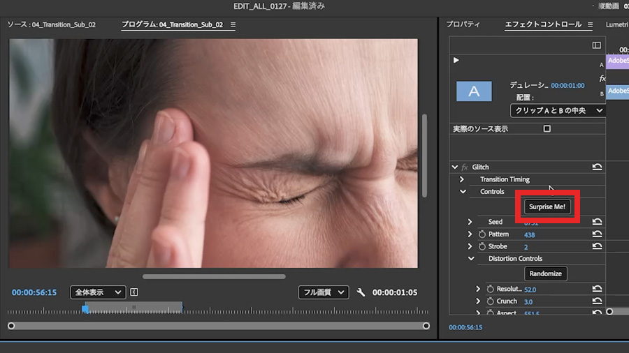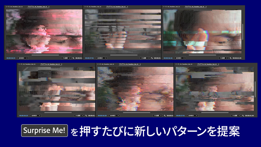 このエフェクト・トランジションたちを選択すると エフェクトコントロールパネルに 「Surprise Me!」