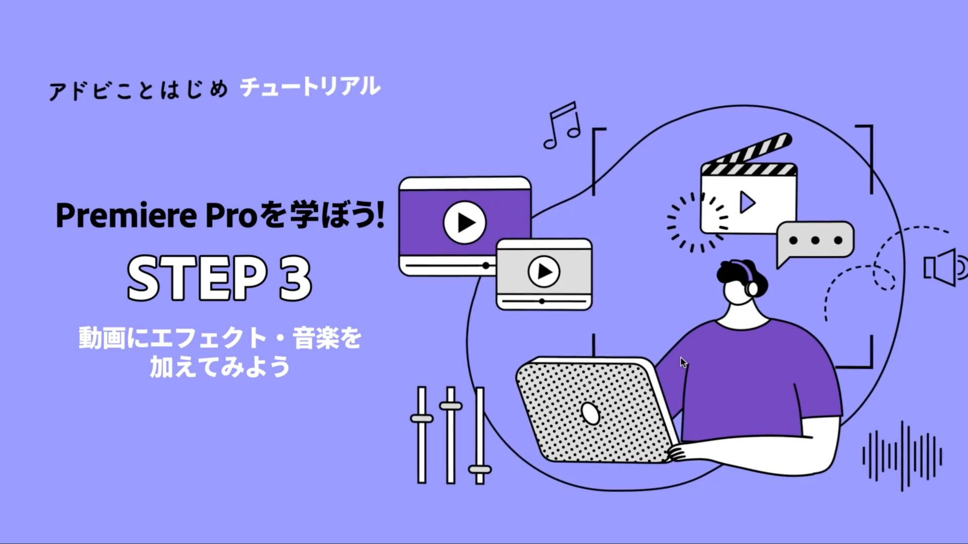 ここまでの3つのステップを通し、Premiereでの基本的な機能や操作を学習しました。学んだ操作を実際に使って、自由に動画編集を楽しんでみて下さい。
