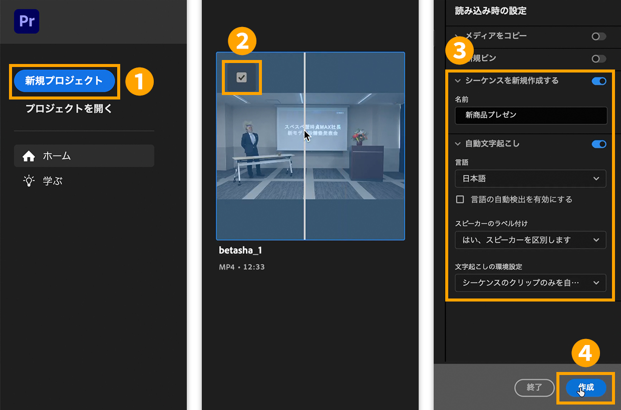 作業に入る前に、練習用の素材をダウンロードしておきましょう。①スタート画面の「新規プロジェクト」をクリック。②ダウンロードしたファイル「betasha_1」を選択。プロジェクト名とシーケンス名に「新商品プレゼン」と入力。③「シーケンスを新規作成する」「自動文字起こし」をオンに、言語は「日本語」に設定します。スピーカーのラベル付けを「はい、スピーカーを区別します」にすることで、文字起こしをする際に複数の話者を区別することができます。④「作成」ボタンをクリック。